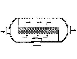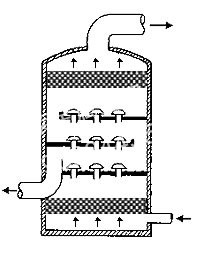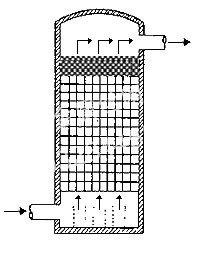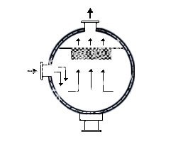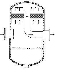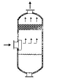 在通常的化工操作中所碰到的氣體中分散液滴的直徑約在0.1~5000μm。一般粒徑在100μm以上的顆粒因沉降速度較快,其分離問(wèn)題很容易解決。通常直徑大于50μm的液滴,可用重力沉降法分離;5μm以上的液滴可用慣性碰撞及離心分離法;對(duì)于更小的細(xì)霧則要設(shè)法使其聚集形成較大顆粒,或用纖維過(guò)濾器及靜電除霧器。絲網(wǎng)除沫器,其主要用于分離直徑大于3μm~5μm的液滴,工作原理如右圖所示。當(dāng)帶有霧沫的氣體以一定的速度上升,通過(guò)架在格柵上的金屬絲網(wǎng)時(shí),由于霧沫上升的慣性作用,使得霧沫與細(xì)絲碰撞而粘附在細(xì)絲的表面上。細(xì)絲表面上的霧沫進(jìn)一步擴(kuò)散及霧沫本身的重力沉降,使霧沫形成較大的液滴沿著細(xì)絲流至它的交織處。由于細(xì)絲的可濕性、液體的表面張力及細(xì)絲的毛細(xì)管作用,使得液滴越來(lái)越大,直至其自身的重力超過(guò)氣體上升的浮力和液體表面張力的合力時(shí),就被分離而下落,流至容器的下游設(shè)備中。只要操作氣速等條件選擇得當(dāng),氣體通過(guò)絲網(wǎng)除沫器后,其除沫效率可達(dá)到97%以上,可以達(dá)到完全去除霧沫的目的。