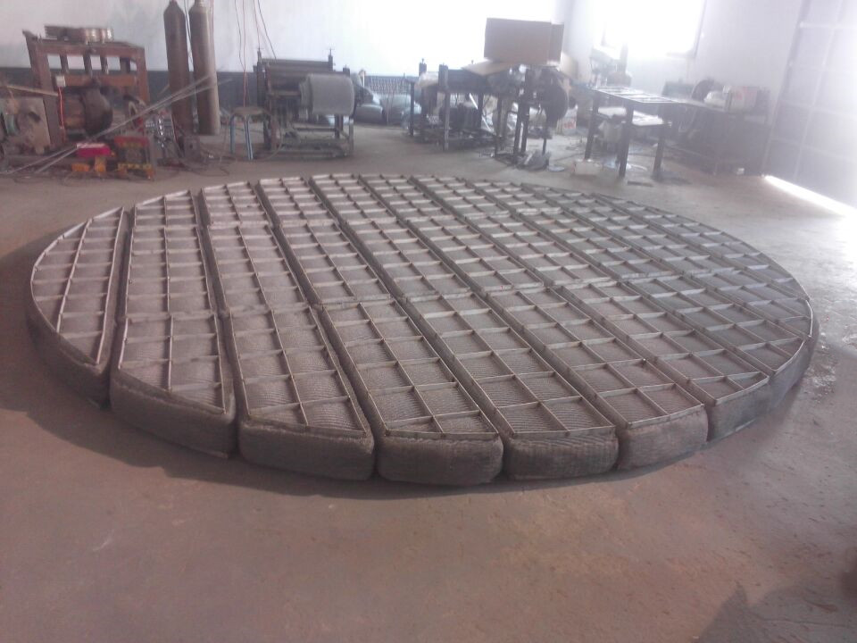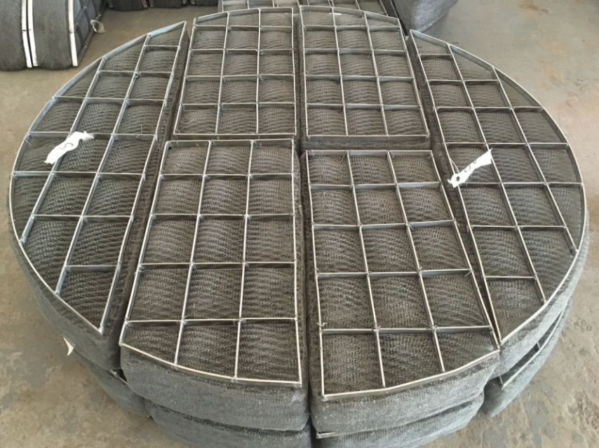 絲網(wǎng)除沫器主要是由絲網(wǎng)、絲網(wǎng)格柵組成絲網(wǎng)塊和固定絲網(wǎng)塊的支承裝置構(gòu)成,絲網(wǎng)為各種材質(zhì)的氣液過(guò)濾網(wǎng),氣液過(guò)濾網(wǎng)是由金屬絲或非金屬絲組成。氣液過(guò)濾網(wǎng)的非金屬絲由多股非金屬纖維捻制而成,亦可為單股非金屬絲如PP聚丙烯和PTFE聚四氟乙烯等工程塑料,也可以采用混編型氣液過(guò)濾網(wǎng)如金屬與聚丙烯或聚四氟乙烯等工程塑料混編、金屬與各種纖維線混編等。